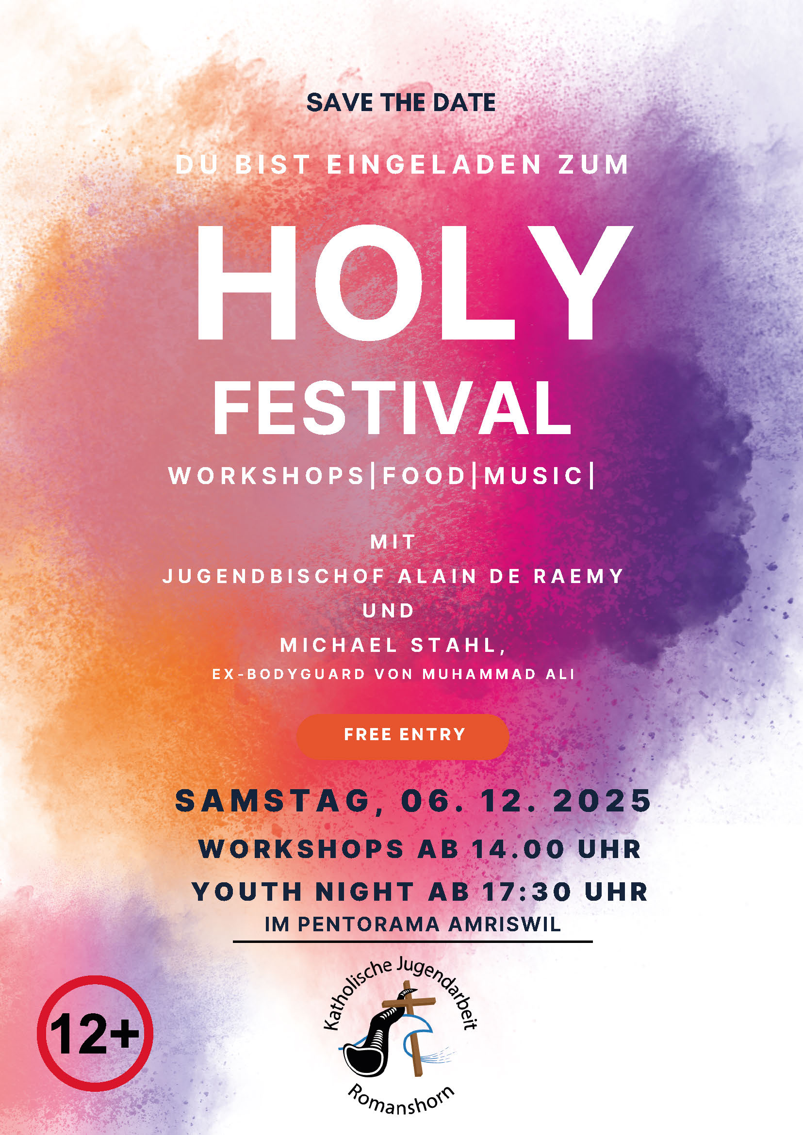 Am 6. Dezember 2025 öffnet das erste Holy Festival der Katholischen Jugendarbeit Romanshorn seine Türen. Ab 14.00 Uhr sind alle Jugendlichen ab 12 Jahren ins Pentorama Amriswil eingeladen. Wir starten mit einem vielfältigen Workshopangebot (Musikworkshops, Töpfern, Zaubern, Praystation, Autorenlesung und vielem mehr). Zwischen 16 und 17 Uhr können wir uns im Streetfood Festival stärken für die anschliessenden Highlights des Abends.